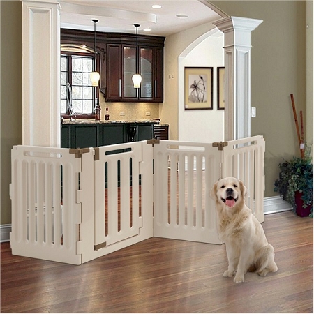 Because the playpen includes a lockable Gate Door, your pet has easy access in/out of the playpen. When used as a gate or room divider, the Gate Door allows you to move freely from one area to another without having to shuffle the entire unit. Do you need a larger size? See the Convertible Indoor Outdoor 6 Panel Pet Playpen.